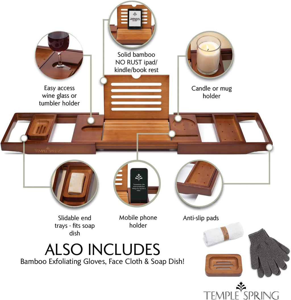 • 100% SATISFACTION GUARANTEE - We are confident you will love your Temple Spring bath tub tray, but if you're not completely satisfied, please get in touch. Experience the luxury and versatility of one of the finest bathtub trays for tub and enjoy the perfect combination of style and functionality.